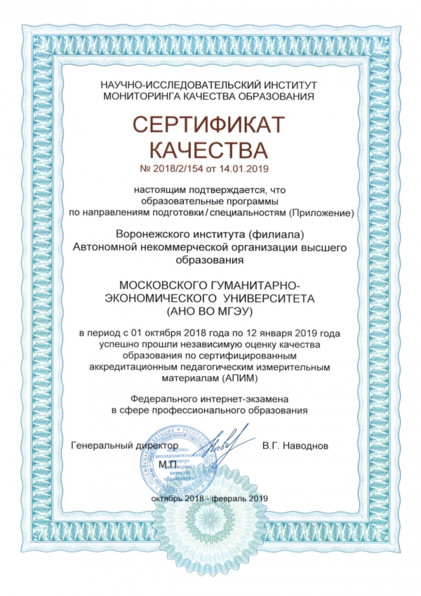 В период с 01 октября 2018 по 12 января 2019 года обучающиеся Воронежского института (филиала) АНО ВО МГЭУ успешно прошли независимую оценку качества образования с использованием сертифицированных педагогических измерительных материалов федерального интернет-экзамена, что подтверждается сертификатами качества НИИ мониторинга качества образованияФото: Загрузить