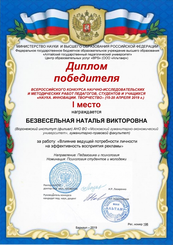 Победителем в номинации «Психология студентов и молодежи» Всероссийского конкурса научно-исследовательских и методических работ педагогов, студентов и учащихся «Наука. Инновации. Творчество», проведенного с 15 по 20 апреля 2019 г. АлтГПУ и Центром образовательных услуг «BPS», стала Безвесельная Наталья Викторовна – студентка 4 курса группы 16ПС-3 заочного отделения гуманитарно-правового факультета Воронежского института (филиала) МГЭУ (научный руководитель — кандидат биологических наук Щекина И.А.).Натальей Викторовной была направлена работа «Влияние ведущей потребности личности на эффективность восприятия рекламы» (научный руководитель – кандидат биологических наук Щекина Ирина Анатольевна). Научная работа выдвинута на конкурс оргкомитетом проведённой в филиале студенческой конференции «Научно-исследовательская деятельность как приоритетное направление подготовки студентов к избранной профессии» (3 апреля с.г.).