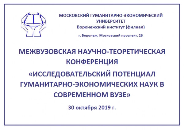 Воронежский институт (филиал) АНО ВО Московского гуманитарно-экономического университета приглашает принять участие в межвузовской научно-теоретической конференции "Исследовательский потенциал гуманитарно-экономических наук в современном вузе", которая состоится 30 октября 2019 г. в здании института по адресу: г. Воронеж, Московский проспект, 26.Информационное письмо