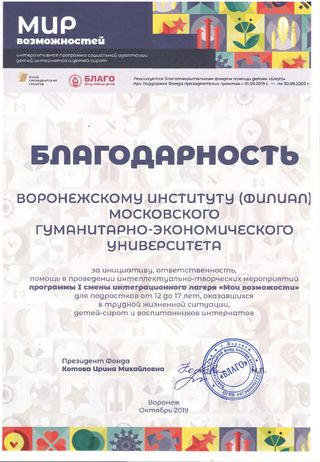25-27 октября, в рамках проекта "Мир возможностей", благотворительный фонд "Благо" при поддержке Фонда президентских грантов и совместно с рядом организаций (в том числе Воронежским институтом (филиалом) МГЭУ) провел интерактивный лагерь, в период работы которого дети - сироты и дети из интернатов Воронежской области осваивали различные социальные навыки, познавали новые виды деятельности, отдыхали и веселились.