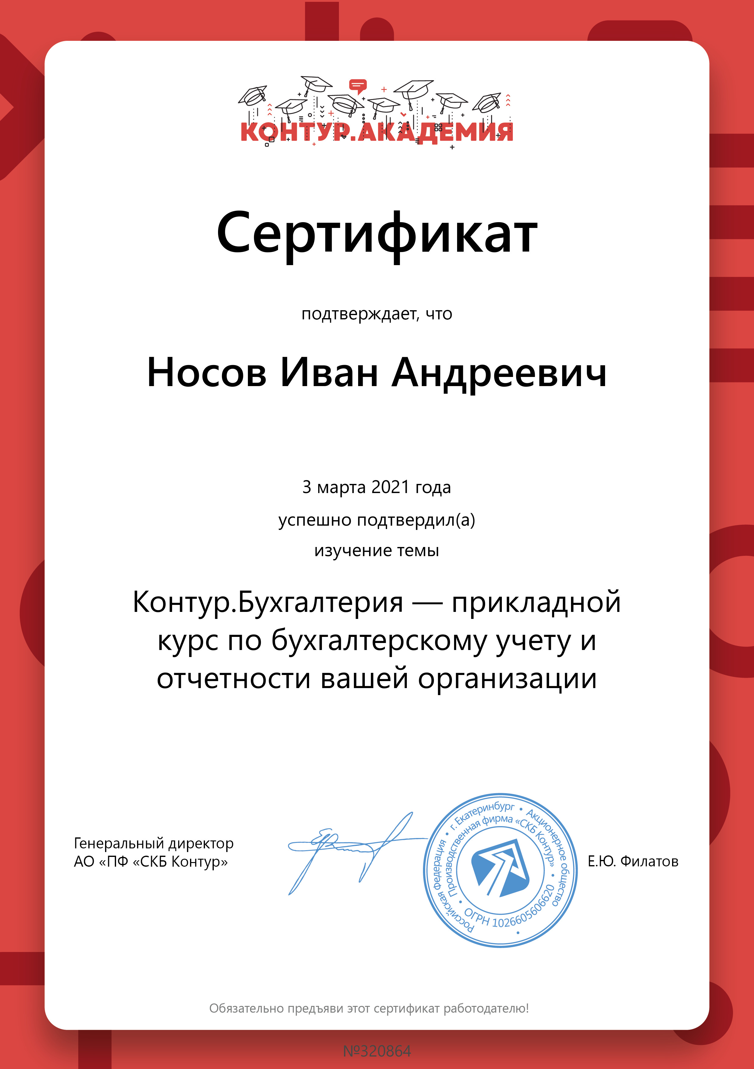 Студенты 3 курса направления подготовки Экономика, профиль "Бухгалтреский учет, анализ и аудит" Полянская Алена, Носов Иван и Албертян Евгения под руководством зав. кафедрой экономики и менеджмента, к.э.н., доцента Родионова Евгения Владимировича приняли участие во всероссийской студенческой онлайн — конкурсе «Контур. Старт!».Ребята успешно справились с заданиями и показали хороший уровень знаний в области бухгалтерского учёта и отчетности организации, что было подтверждено сертификатами.