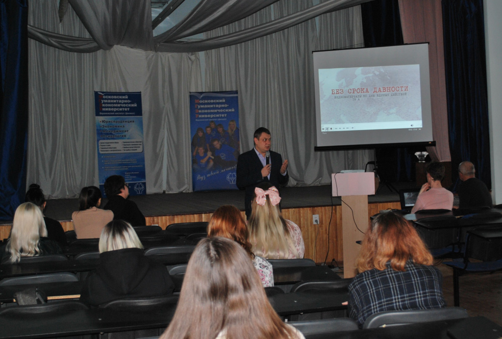 В рамках акции, посвященной памяти жертв геноцида советского народа от немецко-фашистских захватчиков в годы Великой Отечественной войны, перед участниками выступили директор института (филиала) Д.Н. Литвинов и помощник директора по воспитательной работе и связям с общественностью Е.А Львович, после чего состоялся просмотр фильм «Без срока давности", основанного на документальных событиях.