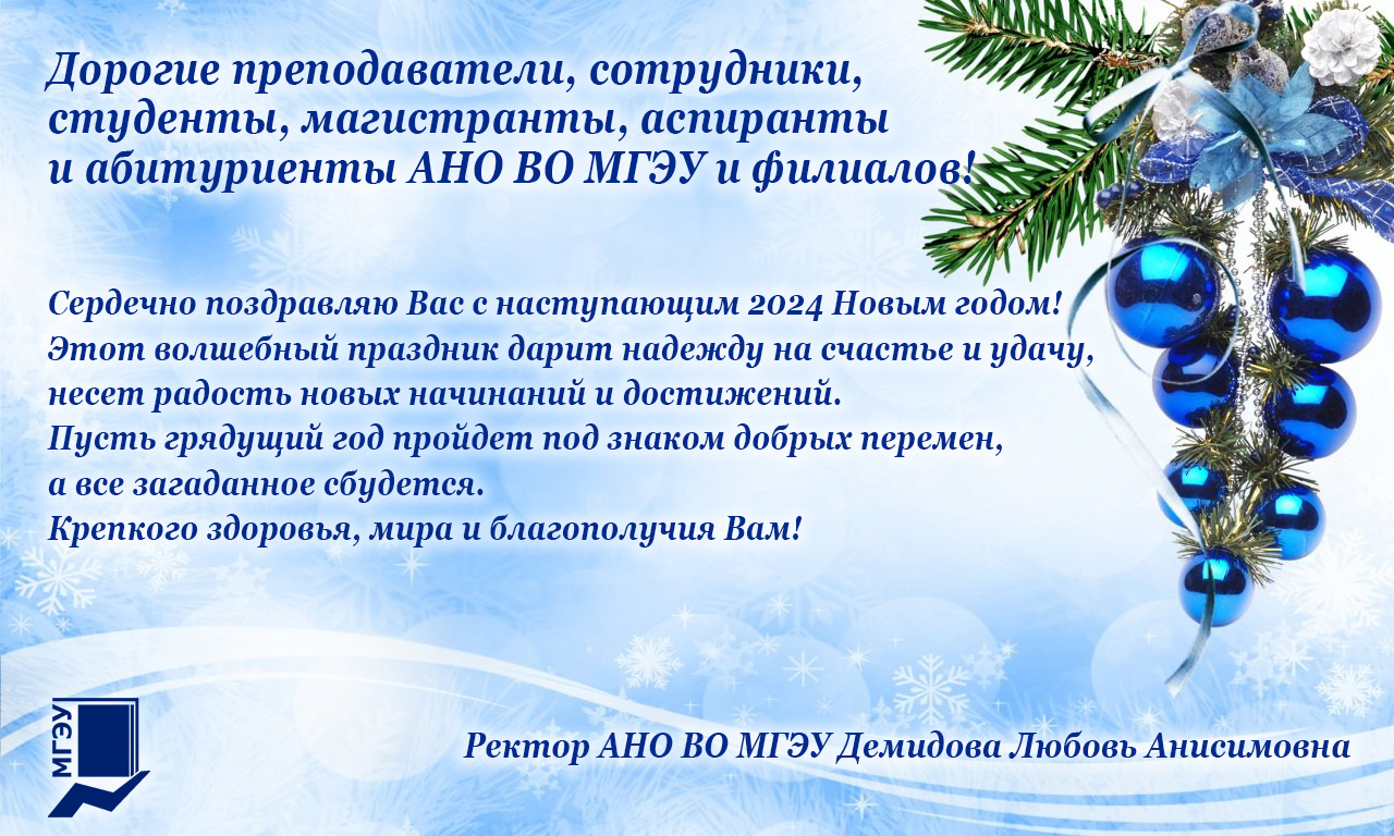 Ректор АНО ВО МГЭУ поздравляет преподавателей, сотрудников, студентов, магистрантов, аспирантов и абитуриентов АНО ВО МГЭУ и его филиалов с наступающим 2024 Новым годом!Фото: Загрузить