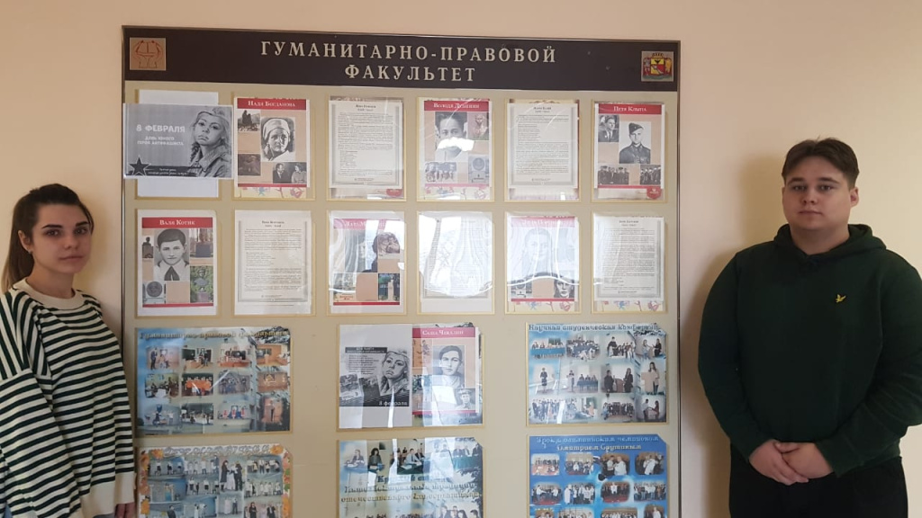 8 февраля традиционно отметается День Юного Героя-Антифашиста.По случаю этой даты на гуманитарно-правовом факультете Воронежского института (филиала) МГЭУ с участием студентов 3 курса направления Юриспруденция были подготовлены два тематических стенда посвященных подвигам Пионеров героев и участников Молодой гвардии в годы Великой Отечественной Войны.